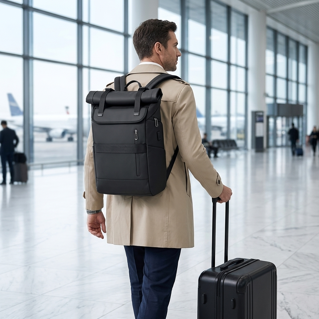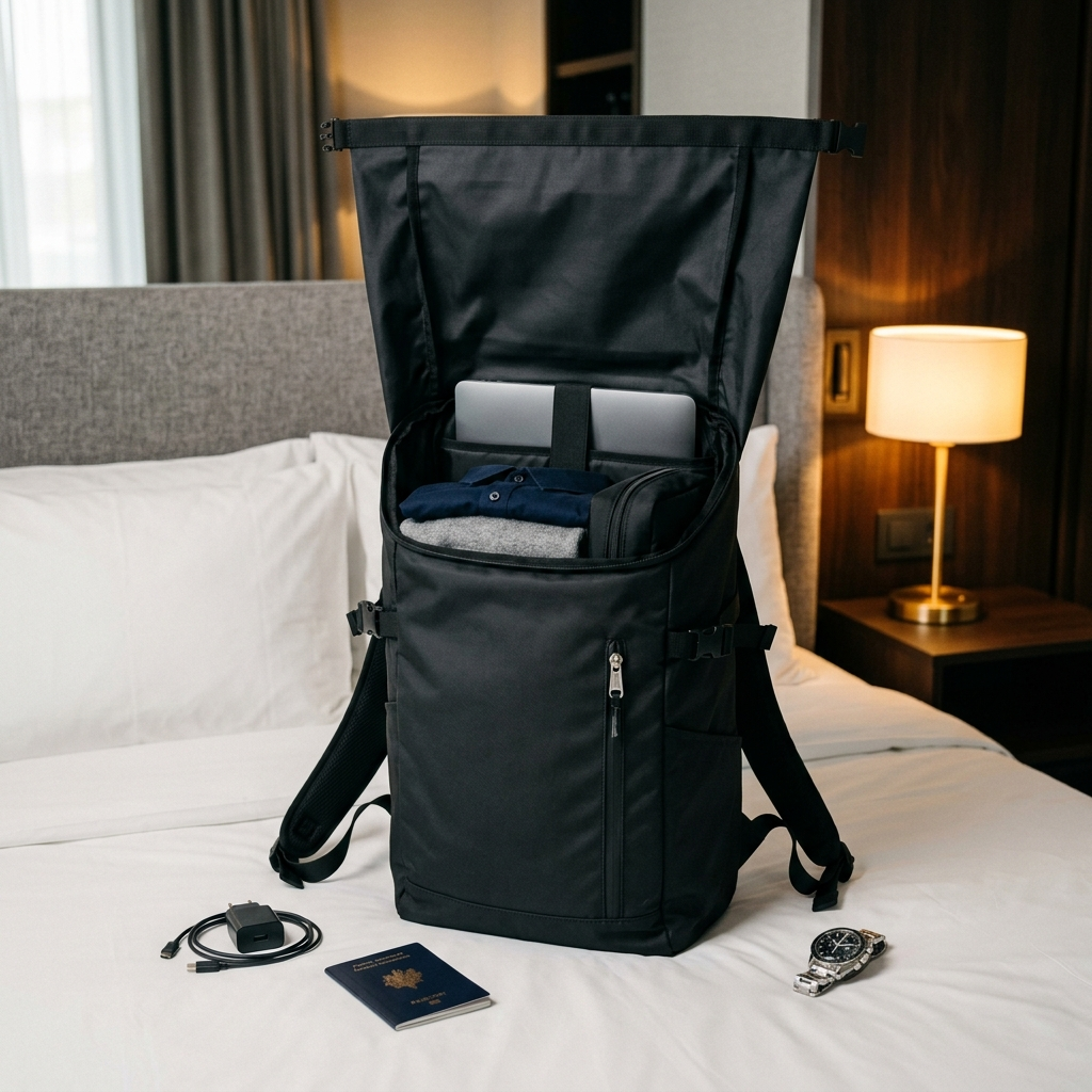 Toile Oxford Ballistic imperméable, compartiment laptop 17,3" protégé, extension +9L en un geste. Vêtements, tech, essentiels — tout rentre. Vous voyagez léger. Vous arrivez prêt.
